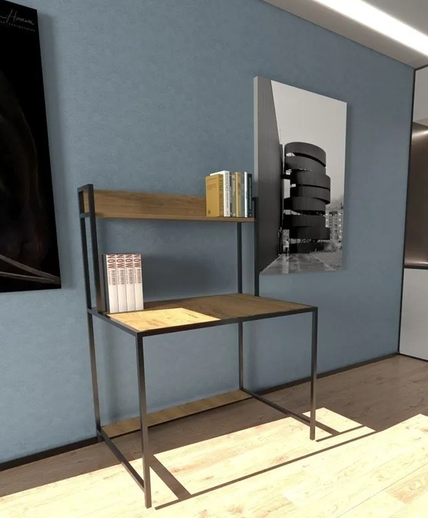 Modern Ahşap Metal Raflı Çalışma Masası – Klasik ve Modernin Mükemmel Uyumu!