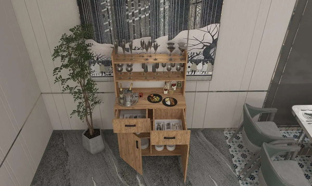 Otel lobilerinden restoranlara, kafelerden ev mutfaklarına kadar her alanda kullanılabilecek bu servant, fonksiyonelliği ve dekoratif yapısıyla mekanlarınızın vazgeçilmezi olacak.