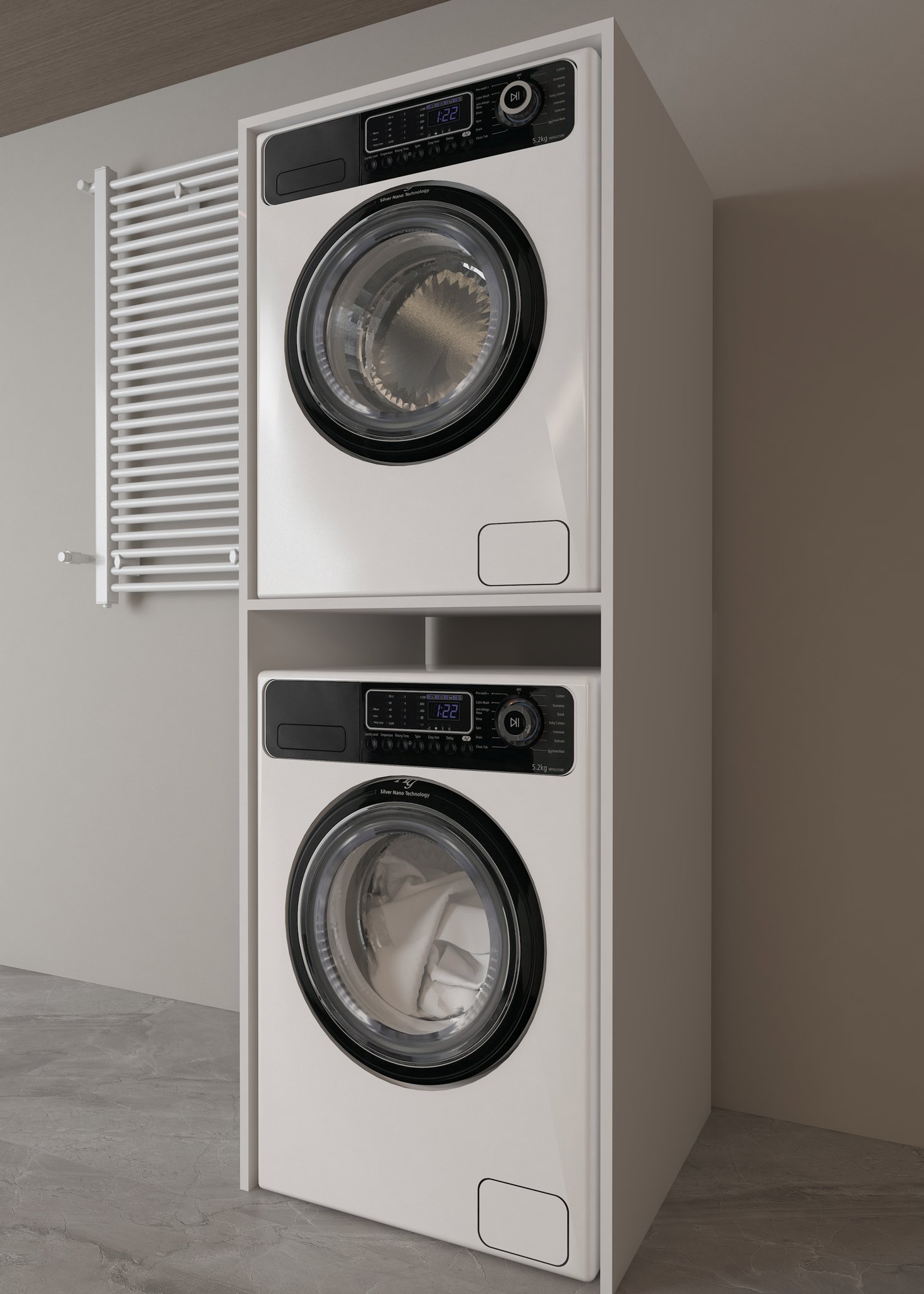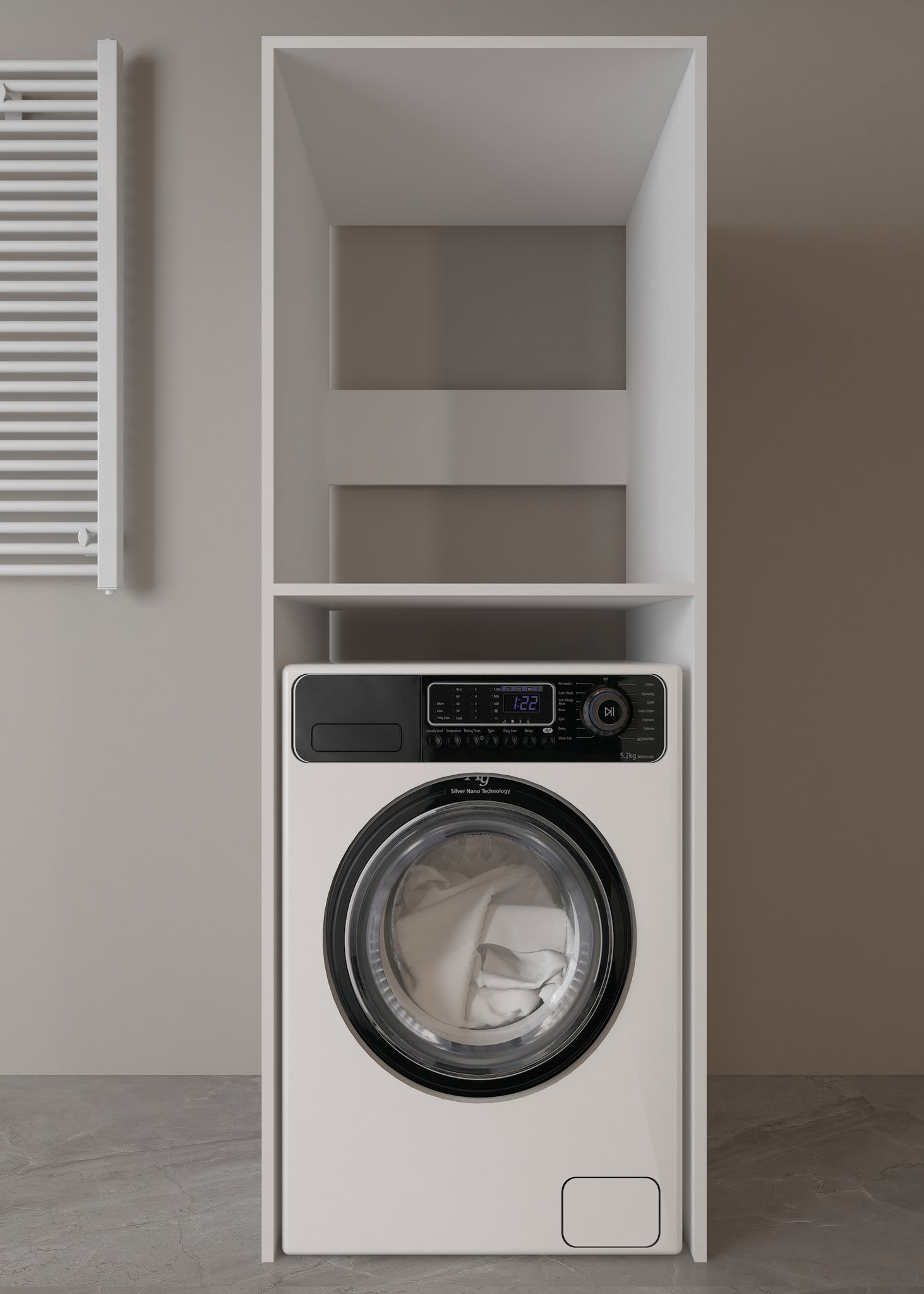 Ek Depolama Alanı: Üst kısımda veya yanlarda bulunan raf ve dolap bölmeleri sayesinde deterjan, yumuşatıcı, temizlik malzemeleri gibi ürünleri kolayca saklayabilirsiniz.