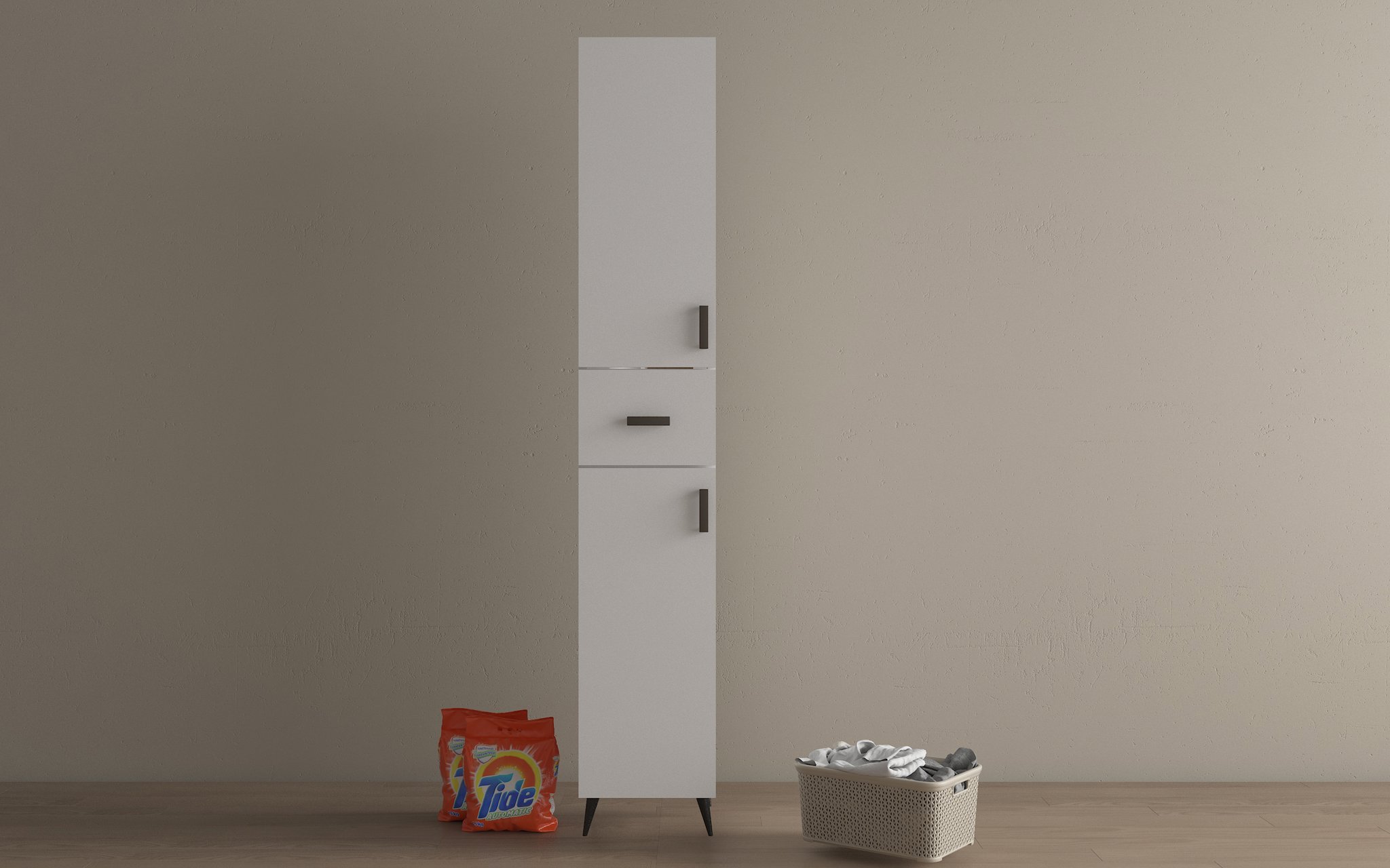 Kompakt ve modern tasarımıyla her alana uyum sağlayan bu dolap, dar alanlarda bile etkili bir depolama çözümü sunar. Beyaz kaplaması, sade ve temiz bir görünüm sağlarken, orta raf bölmesi sayesinde günlük kullanım için pratik bir düzen sağlar. Mutfak, banyo, ofis veya oturma odası gibi pek çok alanda rahatlıkla kullanılabilir.