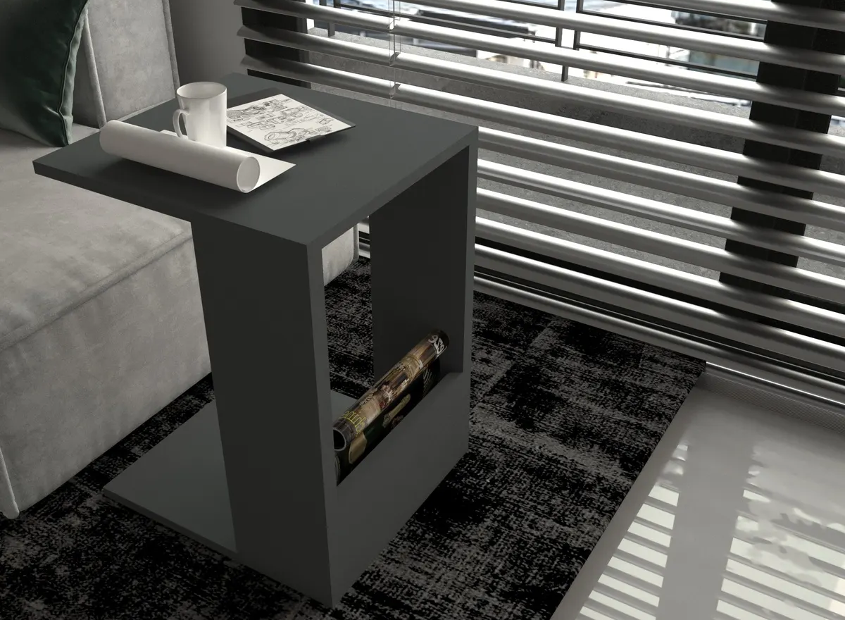 Antrasit melamin kaplı yonga levha malzeme ile üretilmiş, modern ve zarif bir sehpa. Minimalist tasarımıyla her türlü iç mekâna uyum sağlar. Koltuk yanında kullanıma uygun boyutlarıyla eşyalarınızı düzenlerken, estetik bir dokunuş da sağlar.