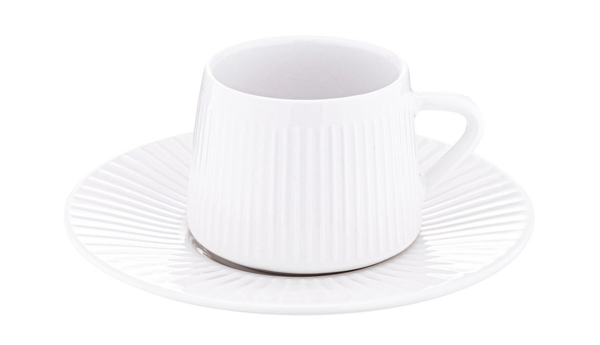 Lara 6 Kişilik Kahve Fincan Takımı - Verti, modern çizgiler ve zarif detaylarla tasarlanmış şık bir kahve takımıdır. 6 kişilik set, 6 kahve fincanı ve 6 tabaktan olmak üzere toplam 12 parçadan oluşur. Her fincan 10.7 cm çapında ve 6 cm yüksekliğindedir; bu da Türk kahvesi için ideal bir ölçüdür. Verti deseni, sofistike çizgiler ve minimal estetik dokunuşlarla her sofrada dikkat çeker.