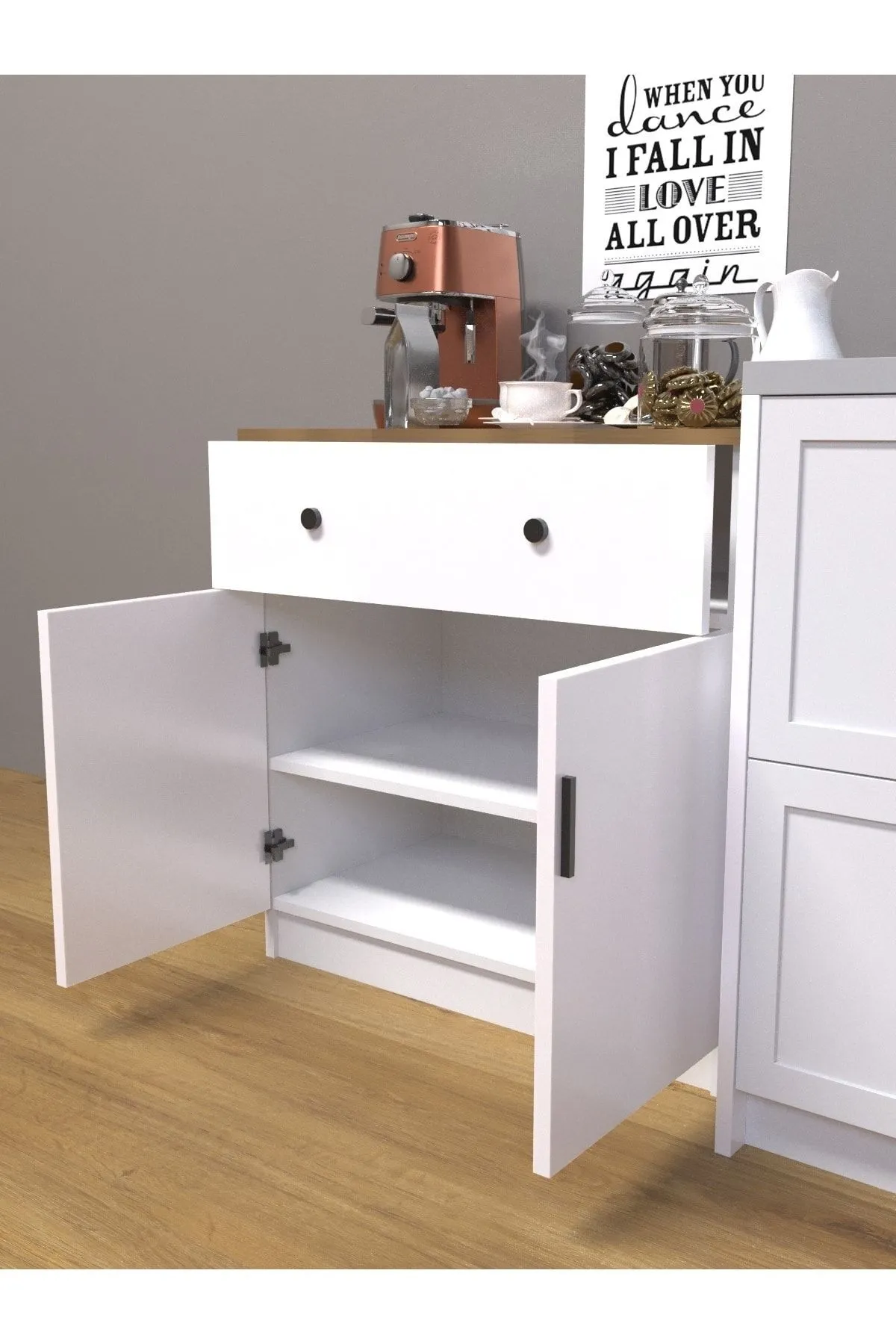 - Düzenli ve Kullanışlı Depolama: Kahve köşenizde tüm içecek hazırlama gereçlerinizi düzenli bir şekilde saklayabilir ve rahatça erişebilirsiniz.